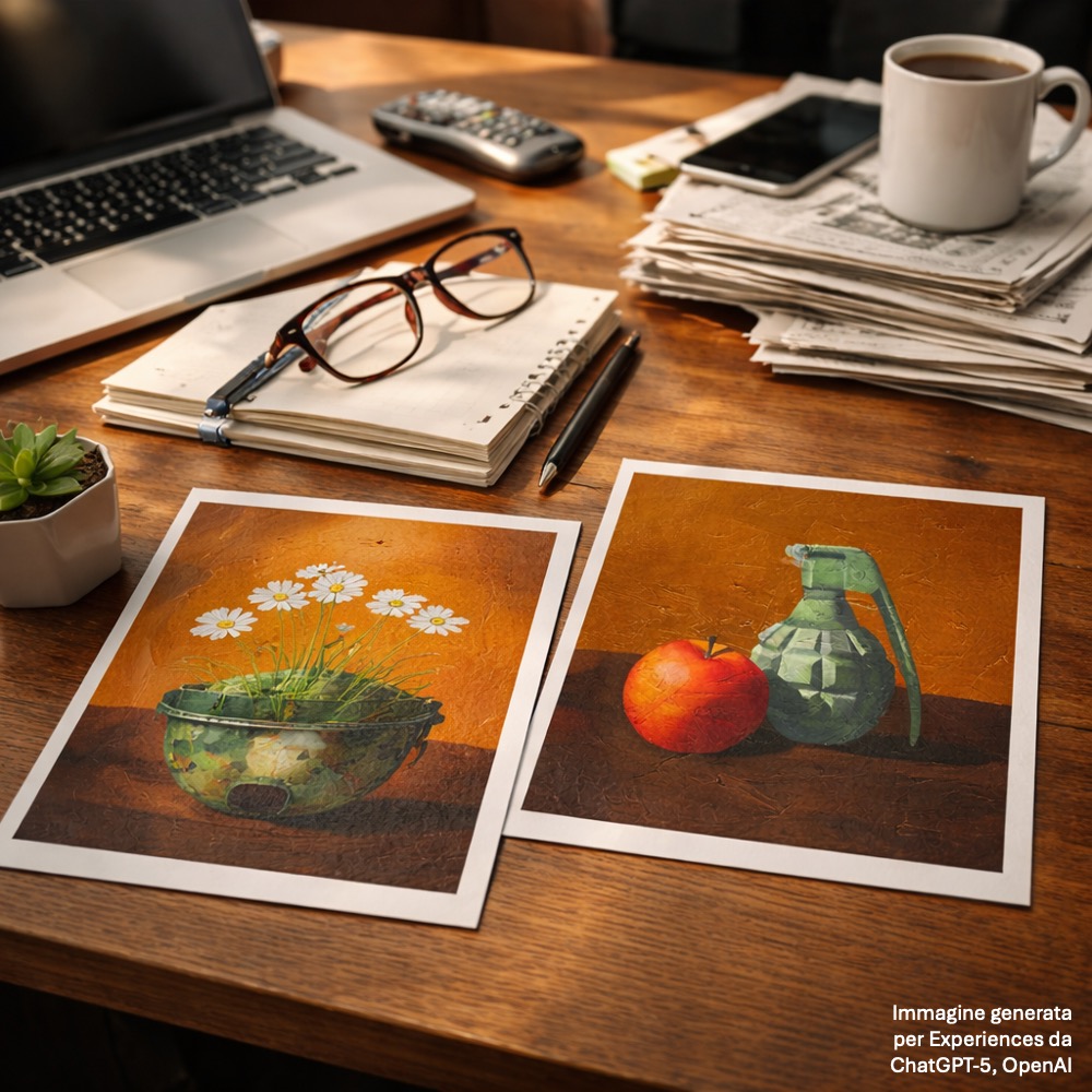 Riemerge così il tema della vanitas, storicamente legato alla riflessione sulla caducità della vita, ma reinterpretato alla luce del presente. Gli oggetti diventano segni ambivalenti, capaci di evocare tanto la tradizione pittorica quanto l’immaginario visivo della contemporaneità, tra simbologie pacifiste e riferimenti ai conflitti attuali.