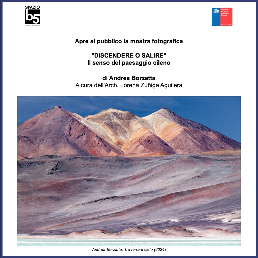 Dal 19 al 30 marzo 2026, Spazio b5 a Bologna ospita la mostra fotografica “Discendere o salire”, curata dall’Arch. Lorena Zúñiga Aguilera, con testo critico di Lorenzo Gresleri e con il patrocinio del Consolato Onorario del Cile per l’Emilia-Romagna. L’esposizione introduce al lavoro del fotografo Andrea Borzatta, artista che ha scelto il paesaggio cileno come campo di osservazione, riflessione e visione. La cerimonia d’inaugurazione ufficiale si terrà sabato 21 marzo alle ore 18:00.